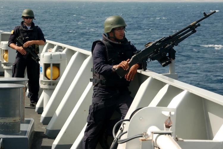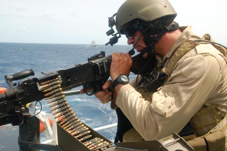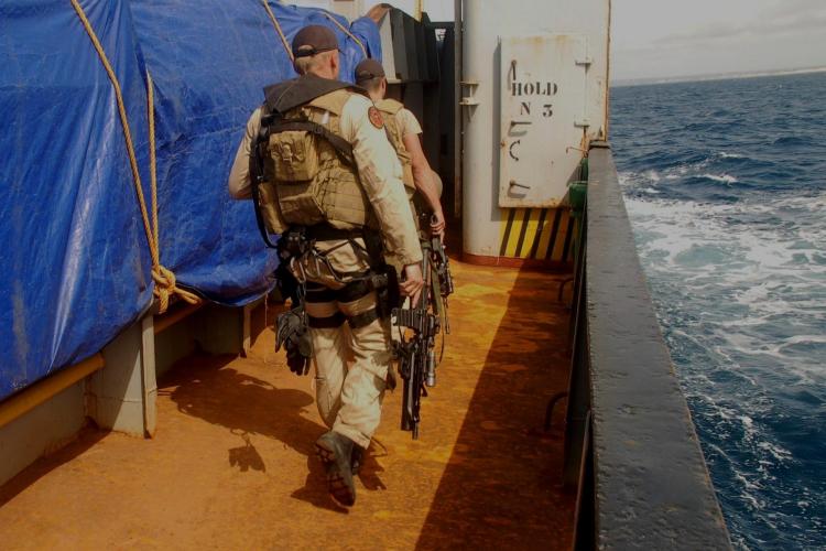 Sergeant Mike van de special forces van de marine beschermt het VN schip Fade 1 tegen piraterij. - Foto's RD