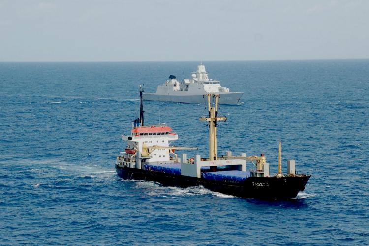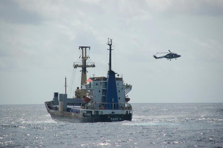 Een Lynx heli voert een verkenningsvlucht uit rond het VN-vrachtschip Fade 1. - Foto's RD