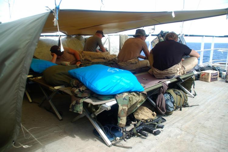 Mariniers slapen in de open lucht bovenop de stuurhut van het VN schip. - Foto's RD