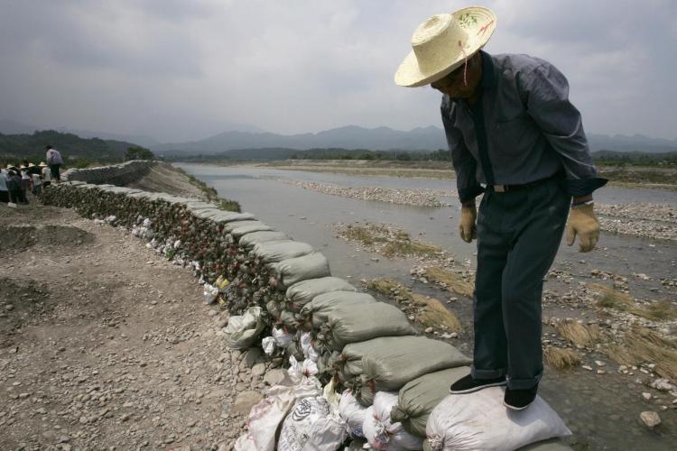 MAANDAG – Een geïmproviseerde muur van met stenen gevulde zakken moet de bevolking rond het Tangjiashanmeer beschermen tegen een mogelijke overstroming. Chinese militairen zetten antitankwapens in om de leegloop van het meer te versnellen. - Foto's RD, Reuters, ANP, EPA, Van Garderen & Dekker, Wim van Vossen jr.