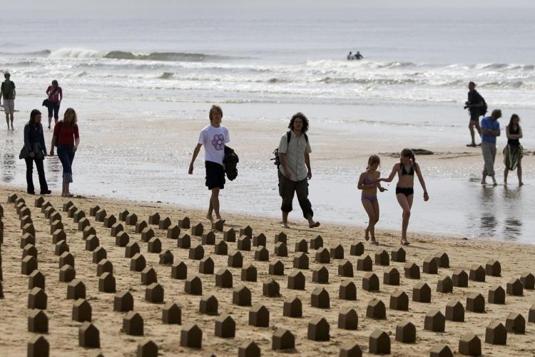 MAANDAG – Op het strand van Katwijk staan zo’n 3000 zandhuisjes gemaakt door kunstenares Stephanie Rhode. Vijftig vrijwilligers hielpen daaraan mee. Veel tijd om van hun creaties te genieten, hadden de kunstenaars niet. De opkomende vloed verzwolg de huisjes aan het eind van de dag.