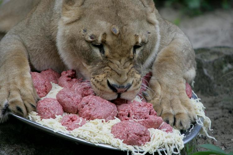 MAANDAG – De leeuwen van Ouwehands Dierenpark in Rhenen hebben spaghetti met gehaktballen voorgeschoteld gekregen. Het dierenpark past vaker een vorm van voedselverrijking toe die goed is voor de gezondheid van de dieren en tegelijkertijd ook voor wat afleiding zorgt.