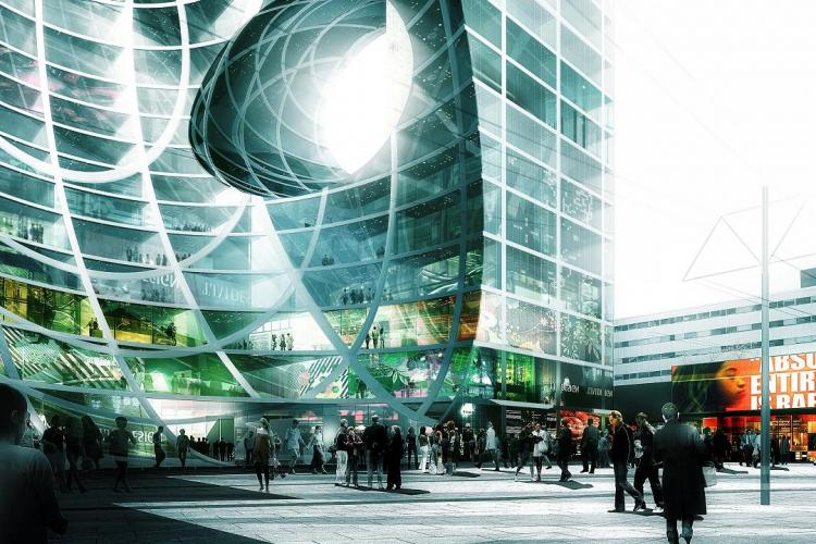 DINSDAG – Een artist’s impression van de kubus die in Rotterdam boven op de tweede Koopgoot moet verrijzen. In de kubus moeten woningen, kantoren, winkels en mogelijk een nieuw theater en museum komen.