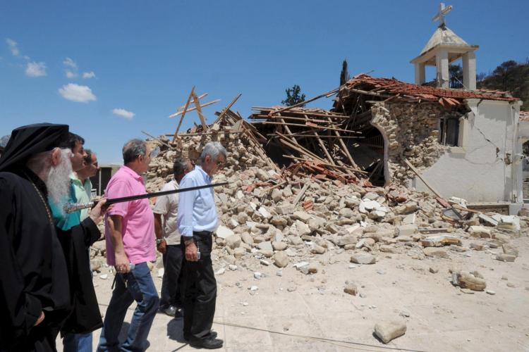 DINSDAG – Een Grieks-orthodoxe priester laat aan bouwkundigen zien wat er van zijn kerkje is overgebleven. Het westen van Griekenland is getroffen door een aardbeving met een kracht van 6,5 op de schaal van Richter. Zeker twee mensen kwamen om het leven en 150 mensen raakten gewond.