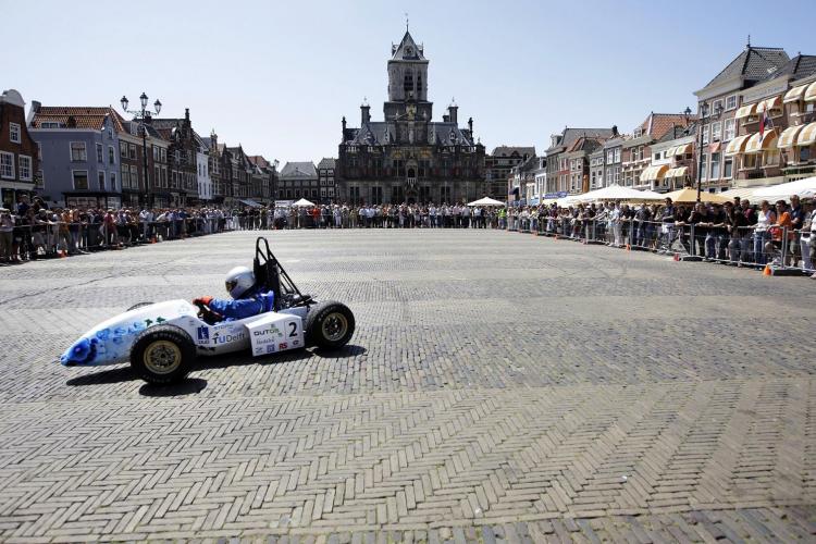 WOENSDAG – Studenten van de Technische Universiteit Delft presenteren op de Markt in Delft een door hen ontworpen duurzame raceauto: de DUT08. De motor van het lichtgewicht ontwerp rijdt op bio-ethanol.