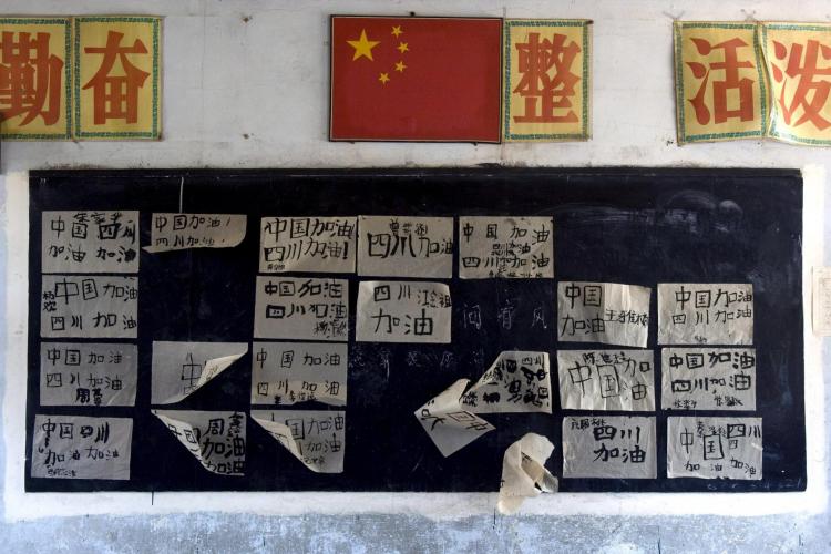 DONDERDAG – Een schoolbord in Shifang, in de Chinese provincie Sichuan, hangt vol met gekalligrafeerde spreuken van leerlingen, zoals ”Kom op, Sichuan” en ”Kom op, China”. Shifang is een van de zwaarst getroffen gebieden van de aardbeving, vorige maand, in Sichuan.