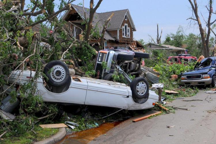 VRIJDAG – De ravage in een straat in Chapman (Kansas) is groot nadat een tornado door het stadje trok. De tornado heeft tijdens zijn verwoestende tocht door de staat Kansas aan twee mensen het leven gekost. Zestig woningen werden geheel verwoest en nog een zestig andere raakten beschadigd.