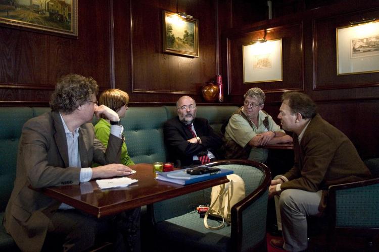 VRIJDAG – Vertegenwoordigers van werkgevers en werknemers in het streekvervoer onderhandelen in een hotel in Bussum over een nieuwe cao. V.l.n.r. Uniebestuurder Teerink, FNV-bestuurder Koppens, werkgeversvoorzitter Van der Sluis, CNV-kaderlid Verkerk en CNV-bestuurslid Kusters.