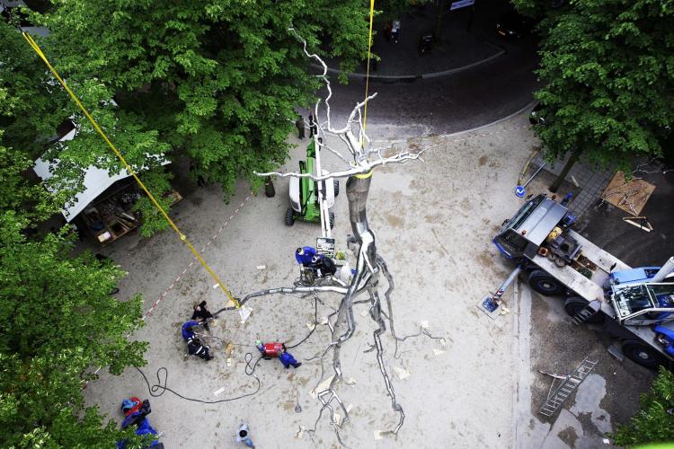 VRIJDAG – Op het Lange Voorhout in Den Haag is de sculptuur ”Inversion” van de Amerikaanse kunstenaar Roxy Paine in elkaar gezet. De ‘boom’ is onderdeel van het evenement Den Haag Sculptuur 2008. Inversion is van roestvrij staal en werd door de kunstenaar zelf van boven naar onder in elkaar gezet.