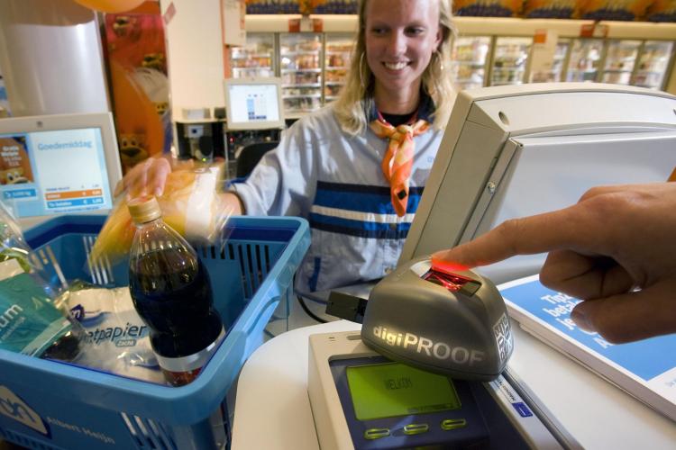 DINSDAG – Klanten van de Albert Heijn in Breukelen kunnen betalen met een simpele vingertip. De vingerafdruk wordt versleuteld tot een unieke code, waaraan het bankrekening- en eventueel bonuskaartnummer worden gekoppeld. Bij de kassa hangt een scanner die de vingerafdruk vervolgens registreert. De proef duurt zes maanden.