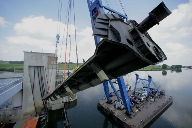 WOENSDAG – In opdracht van Rijkswaterstaat heeft aannemer Hollandia uit Krimpen a/d IJssel de defecte stuwklep uit de sluis bij Lith getild. De klep, die begin 2007 beschadigd is door een breuk in de hijskettingen, wordt vervangen door een authentieke constructie. De klep is 38 meter lang en heeft een gewicht van 55 ton.
