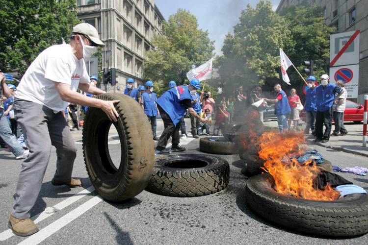 ZATERDAG – Protesterende dokwerkers steken voor het gebouw van het Poolse ministerie van Financiën autobanden in brand. Polen heeft van de EU opdracht gekregen zo snel mogelijk de nationale scheepsbouw te saneren. Dat kan inhouden dat scheepswerven grote bedragen aan overheidssteun zullen moeten terugbetalen en dat zou vervolgens het einde van tal van werven kunnen betekenen.