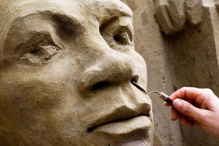 Maandag – Op het Buitenhof in Den Haag werken zandkunstenaars uit diverse landen aan een enorm zandsculptuur, dat wordt gebouwd in het kader van The Hague Festivals 2008. De sculptuur krijgt een afmeting van 22 meter lang, 7 meter breed en een aantal toppen van 6,5 meter hoogte. Tot 31 augustus kan het publiek de sculptuur bewonderen. - Foto ANP