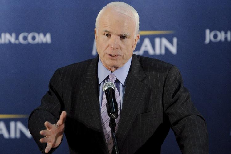 Dinsdag – De Republikeinse presidentskandidaat John McCain praat met journalisten op een persconferentie in Riverside, Californië. - Foto EPA