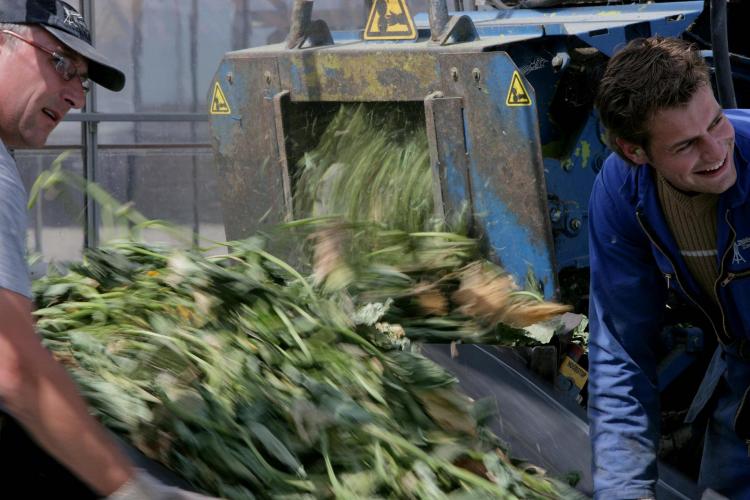 Dinsdag –Met een speciale machine en in een razend tempo worden de komkommerresten van teler J. van Aalten uit Huissen uit zijn kassen verwijderd. De plantenversnipperaar van Tuinbouwloonbedrijf Knuiman BV kan in enkele uren een paar duizend hectare plantenafval verwerken en bespaart tuinders zo veel tijd en geld. - Foto VidiPhoto