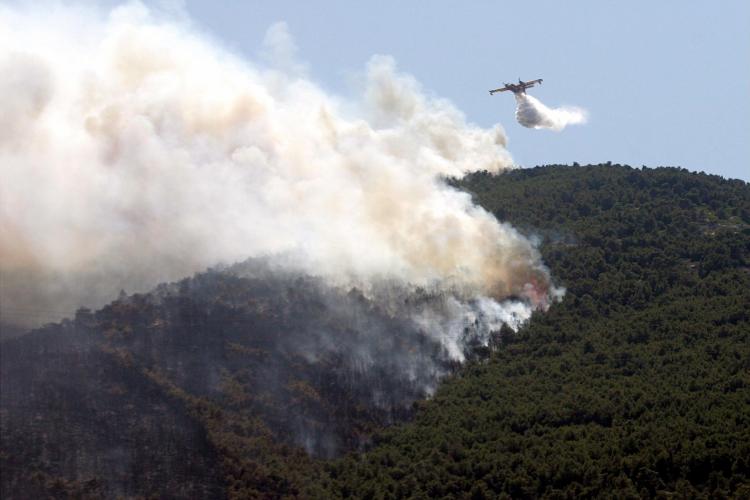 Woensdag – Een blusvliegtuig dropt een lading water boven een bosbrand op een berg ten oosten van de Griekse stad Athene. - Foto EPA