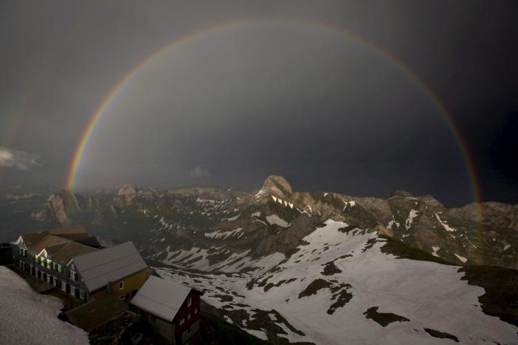 Woensdag – Een fraaie regenboog boven Berggasthaus Saentis in de Appenzeller Alpen, Zwitserland. - Foto EPA