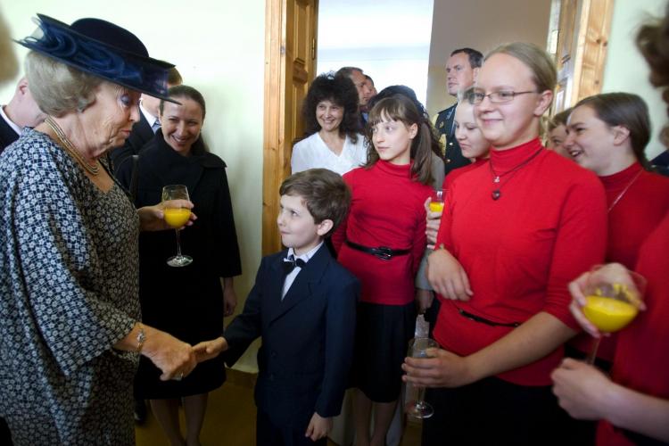 Donderdag – Koningin Beatrix ontmoet in het Juozas Naujalis Muziekgymnasium de tienjarige Statijs Makstutis die met zijn klarinet heeft opgetreden voor de koningin. Koningin Beatrix brengt een staatsbezoek aan de Republiek Litouwen op uitnodiging van president Valdas Adamkus. - Foto ANP