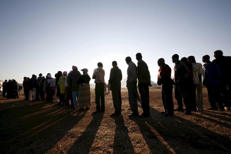 Vrijdag – Zimbabwanen staan in de rij om hun stem uit te brengen bij een stembureau in Harare. Na de tweede verkiezingsronde heeft president Robert Mugabe de overwinning opgeëist. Zijn belangrijkste tegenstrever, oppositieleider Morgan Tsvangirai, had zich eerder al uit de verkiezingsstrijd teruggetrokken. - Foto EPA