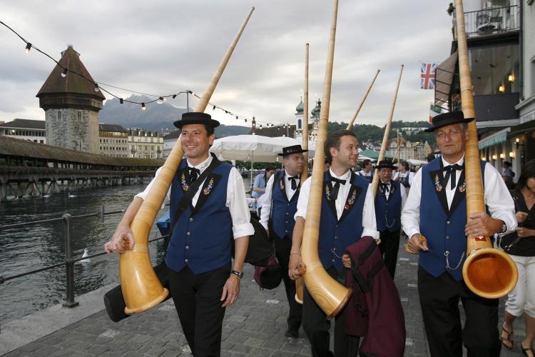 Vrijdag – Muzikanten dragen hun alpenhoorns door de stad tijdens een jodelfestival in Luzern, Zwitserland. - Foto EPA