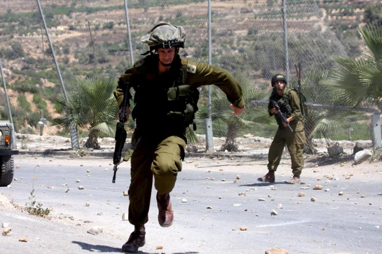 MAANDAG – Israëlische soldaten rennen naar hun posities tijdens een confrontatie met Palestijnse militanten, na de begrafenis van de zestienjarige Mohammed Abu Sara in Beit Omar, vlak bij Hebron op de Westbank. De jongen werd neergeschoten toen hij een molotovcocktail naar Israëlische militairen gooide.