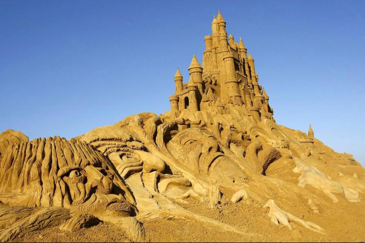 DINSDAG – Dit zandkasteel is een van de blikvangers op het zandsculptuurfestival in het Belgische Blankenberge. Zo’n vijftig kunstenaars uit dertien landen bouwden aan de Vlaamse kust kastelen. Het team liet daarvoor 20.000 ton zand (600 vrachtwagens vol) aanrukken.