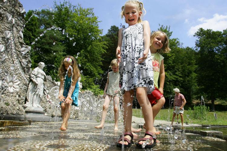 DONDERDAG – Kinderen vermaken zich, bij temperaturen boven de 30 graden Celsius, bij het water van de Bedriegertjes in het Gelderse Rozendaal. De waterattractie bij Kasteel Rosendael vindt haar oorsprong in de zeventiende eeuw, en was destijds bedoeld voor volwassenen. Het water is afkomstig uit een bron op de Posbank bij Arnhem.