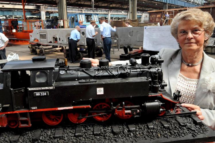 VRIJDAG – De directeur van de Mecklenburgische Bäderbahn Molli, Angelika Muenchow, staat in de fabriek in Meiningen naast een model van een historische stoomlocomotief. Het originele exemplaar van de locomotief is het eerste in vijftig jaar dat herbouwd wordt in Duitsland; de locomotief moet aan het einde van dit jaar klaar zijn.