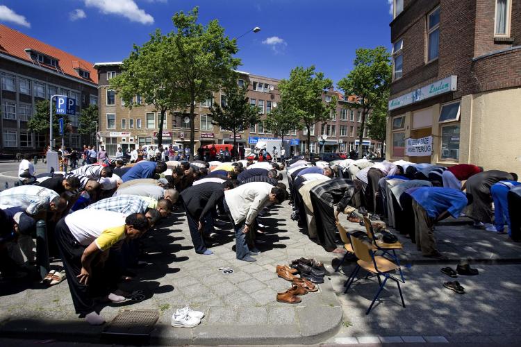 ZATERDAG – Voor de ingang van in de aanbouw zijnde Essalammoskee in Rotterdam wordt uit protest een openlucht gebedsdienst gehouden. De protestbijeenkomst mondde uit in relletjes. De verbannen moskeegangers verzetten zich tegen de invloed van geldschieters uit Dubai.