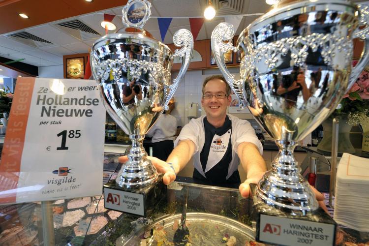 ZATERDAG – Arie Schot, eigenaar van Visgilde Oosterschelde in Bergen op Zoom, toont trots de beker voor de beste haring van Nederland en de beker van vorig jaar. Hij is de winnaar van de 27e Nationale Haringtest van het AD die de krant heeft gepubliceerd.