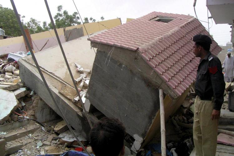MAANDAG – Een Pakistaanse politieman bekijkt de ravage die ontstond nadat een gebouw van vier verdiepingen instortte in de havenstad Karachi. Zeker tien mensen kwamen om het leven en zeventien anderen raakten gewond.