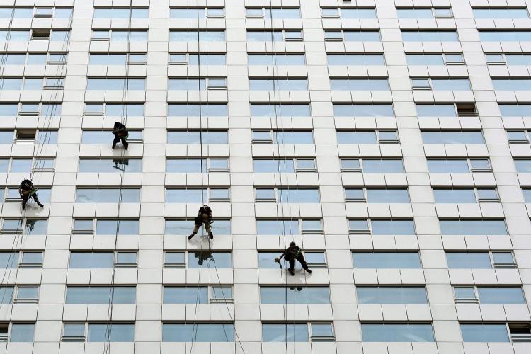 MAANDAG – Medewerkers van Height Specialists wassen de ramen van de Montevideotoren op de Kop van Zuid in Rotterdam. De woontoren is 155 meter hoog. Al abseilend werd de klus geklaard. Het bedrijf is gespecialiseerd in industrieel klimmen.