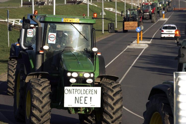 WOENSDAG – Boze boeren demonstreren in Zeeuws-Vlaanderen tegen de ontpolderingsplannen in Zeeland, maart 2006. Met protestacties wilden zij de uitvoering van die plannen voorkomen. Nu de Eerste Kamer heeft ingestemd met de Scheldeverdragen, blijft die optie toch bestaan.