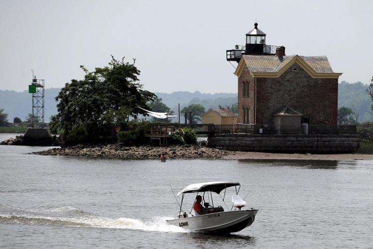 WOENSDAG – Een motorboot passeert de vuurtoren van Saugerties, New York. Het gebouw staat aan de rivier de Hudson. De toren stamt uit 1869 en is nog in werking. Ook fungeert hij als museum en bed & breakfast voor toeristen en andere bezoekers.