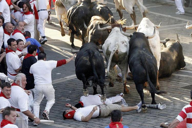 DONDERDAG – Op de derde dag van de stierenrennen in het Spaanse Pamplona zijn twee gewonden gevallen. Een 22-jarige Amerikaan die door een stier op de hoorns werd genomen; een Griek raakte gewond aan zijn gezicht toen hij viel en een stier over hem heen stormde. In totaal zijn er bij de stierenrennen de afgelopen dagen zeven mensen gewond geraakt.