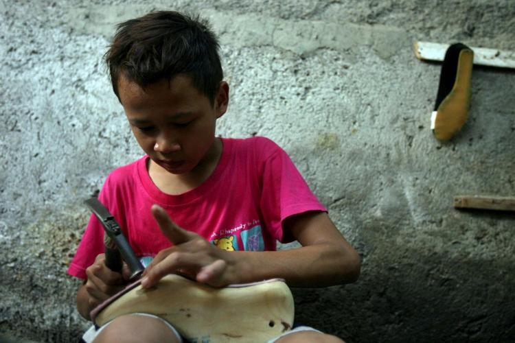 ZATERDAG – Een Indonesisch jongetje werkt in een schoenenfabriekje in Bogor. De regering in Jakarta wil in 2011 zo’n 22.000 werkende kinderen naar school sturen. In de eerste fase van dit plan zijn al ruim 2000 kinderen uit handen van uitbuitende ondernemers gehaald.
