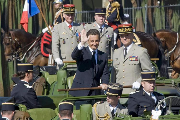 PARIJS - De Franse president Nicolas Sarkozy zwaait vanuit een open jeep naar het publiek. - Foto EPA