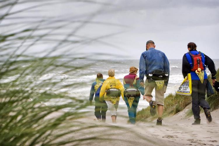 MAANDAG Duizend wandelaars zijn begonnen aan de vijftigste editie van de Strandzesdaagse. De wandelaars lopen ruim 140 kilometer langs de Nederlandse kust, van Hoek van Holland naar Den Helder. De lengte van de tocht varieert dagelijks van 10 tot 30 kilometer. - Foto ANP