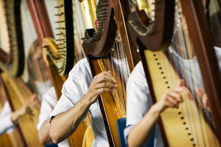 WOENSDAG In de Passenger Terminal in Amsterdam doen harpisten onder leiding van Kevin Kaska een poging om als grootste harporkest ooit in het Guinness Book of Records te komen. - Foto ANP