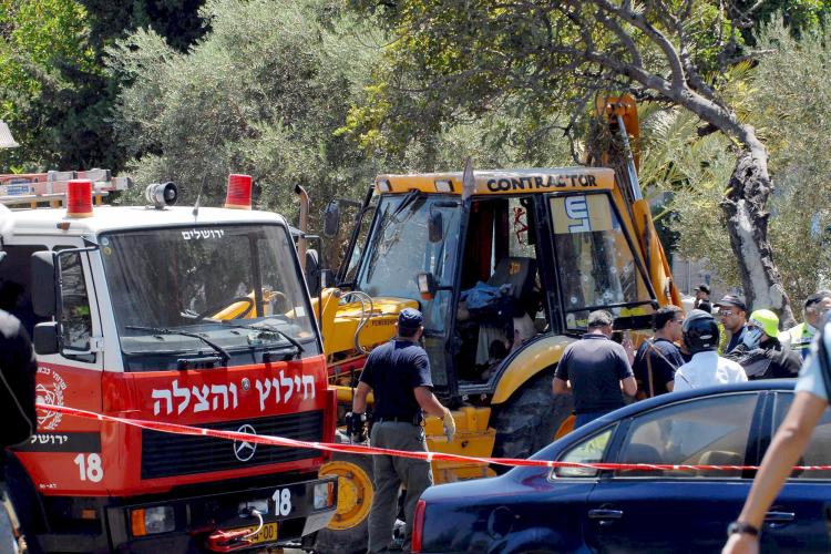 WOENSDAG Net als drie weken geleden pleegt een Palestijn uit Oost-Jeruzalem een aanslag met een shovel in het centrum van Jeruzalem. Daarbij zijn vijf gewonden gevallen. Een van de slachtoffers raakte een gedeelte van zijn been kwijt. De bestuurder van de shovel werd door een automobilist en een grenswacht doodgeschoten. - Foto EPA
