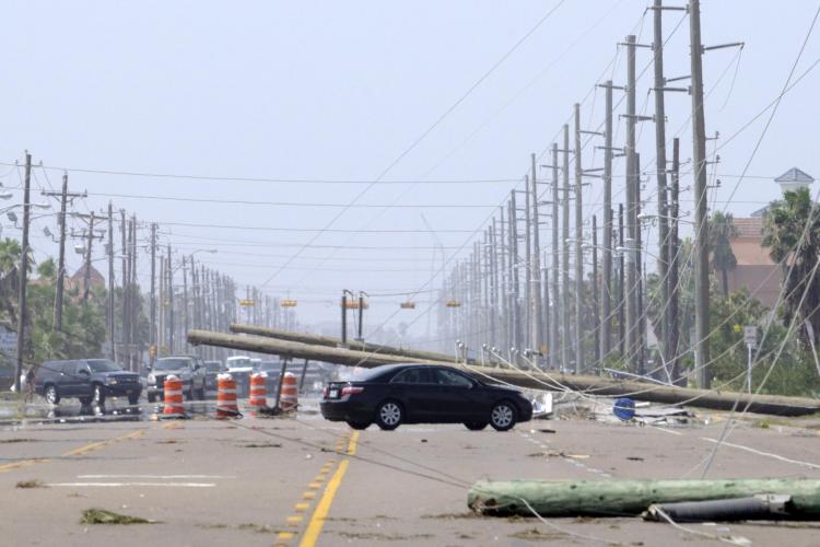 VRIJDAG Een auto passeert omgewaaide elektriciteitspalen op het Texaanse eiland South Padre, waar de orkaan Dolly aan land kwam. De storm trok, met windsnelheden van zon 160 kilometer per uur, een spoor van vernielingen door Texas en Mexico. In Mexico zijn zeker twee mensen om het leven gekomen. - Foto EPA