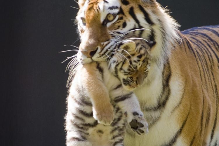 ZATERDAG Een Siberische tijger in Safaripark Beekse Bergen in Hilvarenbeek toont een van de drie jongen die zij zeven weken geleden op de wereld heeft gezet. De tijgerdrieling, Alyona, Arisha en Tijs, hebben zich voor het eerst laten zien in een buitenverblijf van het park. Het is 23 jaar geleden dat er een nest Siberische tijgers gezond en wel in het safaripark werd geboren. - Foto ANP