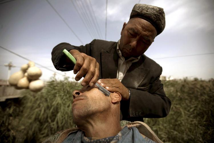 MAANDAG – Een kapper scheert een klant bij de rivier de Tumen in China. Traditionele kappers verdienen tussen de 10 en de 30 cent per klant. Vooral de oudere mannen uit het dorp laten zich regelmatig knippen en scheren. Populaire kappers hebben soms zo’n veertig klanten per dag. - Foto EPA