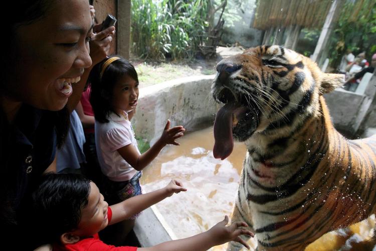 MAANDAG – Bezoekers van een dierentuin in de Filipijnse stad Malabon City bekijken van dichtbij een Bengaalse tijger. In de dierentuin is extra aandacht besteed aan dierendag. In de dierentuin worden extra rondleidingen gegeven in verband met dierendag. Zo worden bezoekers geïnformeerd over dieren en dierenwelzijn. - Foto EPA