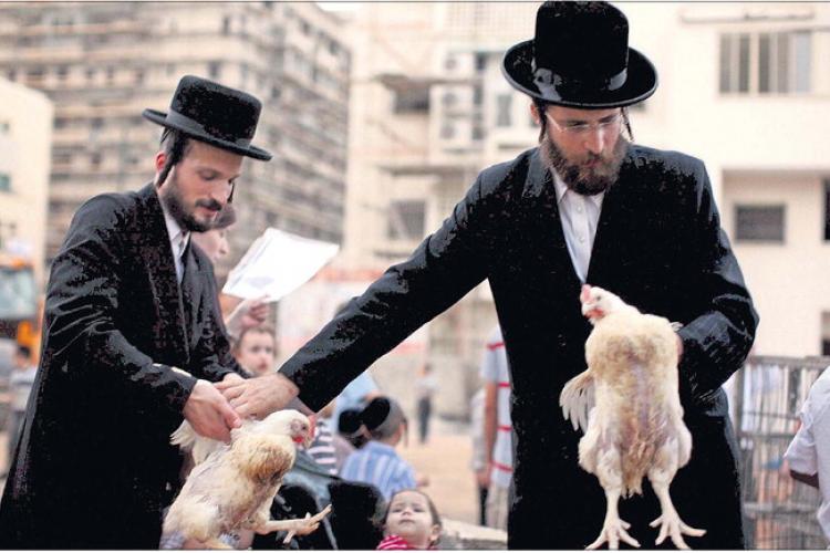 DINSDAG – Orthodoxe joden in Bnei Brak maken zich gereed voor het Kaparotritueel, waarbij zij een levende kip driemaal boven iemands hoofd zwaaien onder het opzeggen van speciale gebeden. Hiermee worden de zonden symbolisch overgedragen op het dier. - Foto EPA