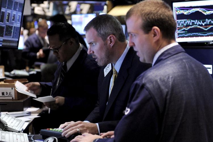 DINSDAG – Gespannen handelaren op de beursvloer in New York bij de start van de handelsdag. Wereldwijd reageren beurzen op de huidige financiële crisis. - Foto EPA