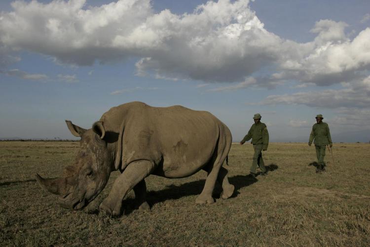 WOENSDAG – Parkopzichter Patrick Muriithi (r.) en zijn collega Charles Mucheke volgen Max, de witte neushoorn in het Ol Pejeta Conservancy. Binnen twee weken hebben stropers drie keer geprobeerd neushoorns te doden. Vier rangers houden daarom de wacht bij het weesdier Max. - Foto AP
