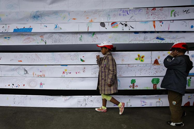 DONDERDAG – In het stadion van een Haagse voetbalclub hangt een kindertekening van meer dan 5 kilometer lengte. Ruim 20.000 kinderen werkten aan de tekening, in de hoop op vermelding in het Guinness Book of Records. Met de actie is 2500 euro opgehaald. Het geld is bestemd voor de opvang van ernstig zieke kinderen in het Mappa Mondo huis in Rijswijk. - Foto ANP