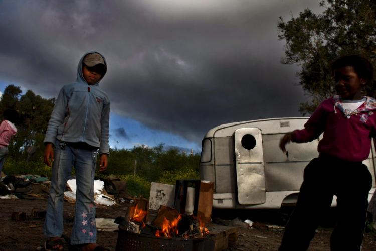 DONDERDAG – Kinderen scharen zich rond een vuurtje in de krottenwijk Masiphumelele, in Kaapstad. De Zuid-Afrikaanse regering is bezig met een grootschalige operatie om illegale bouwsels op te ruimen. Ook de hutjes in Masiphumelele staan op de nominatie om te worden gesloopt. - Foto EPA