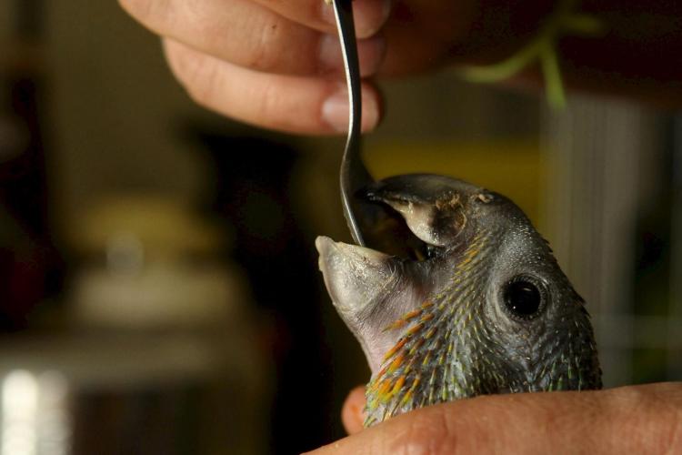 VRIJDAG – Een werknemer van de Braziliaanse natuurbescherming geeft een van de 200 jonge parkieten, die in beslag zijn genomen bij smokkelaars, te eten. De parkieten werden ontdekt tijdens een inval van de federale politie in Serra das Araras. - Foto EPA